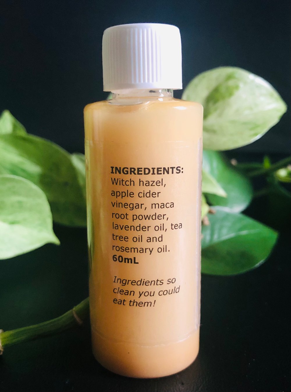 Witch hazel, apple cider vinegar, maca root powder, lavender oil, tea tree oil and rosemary oil.
